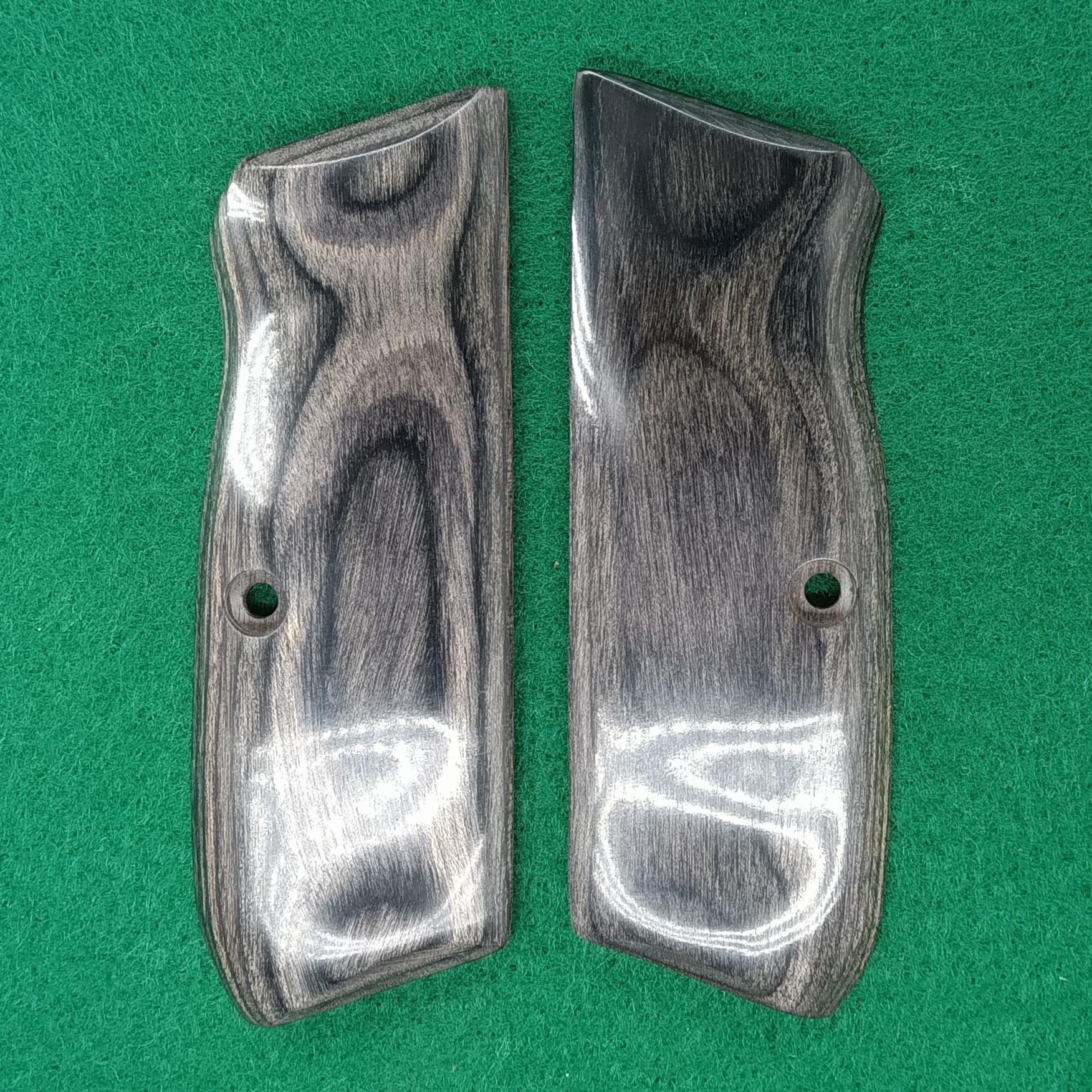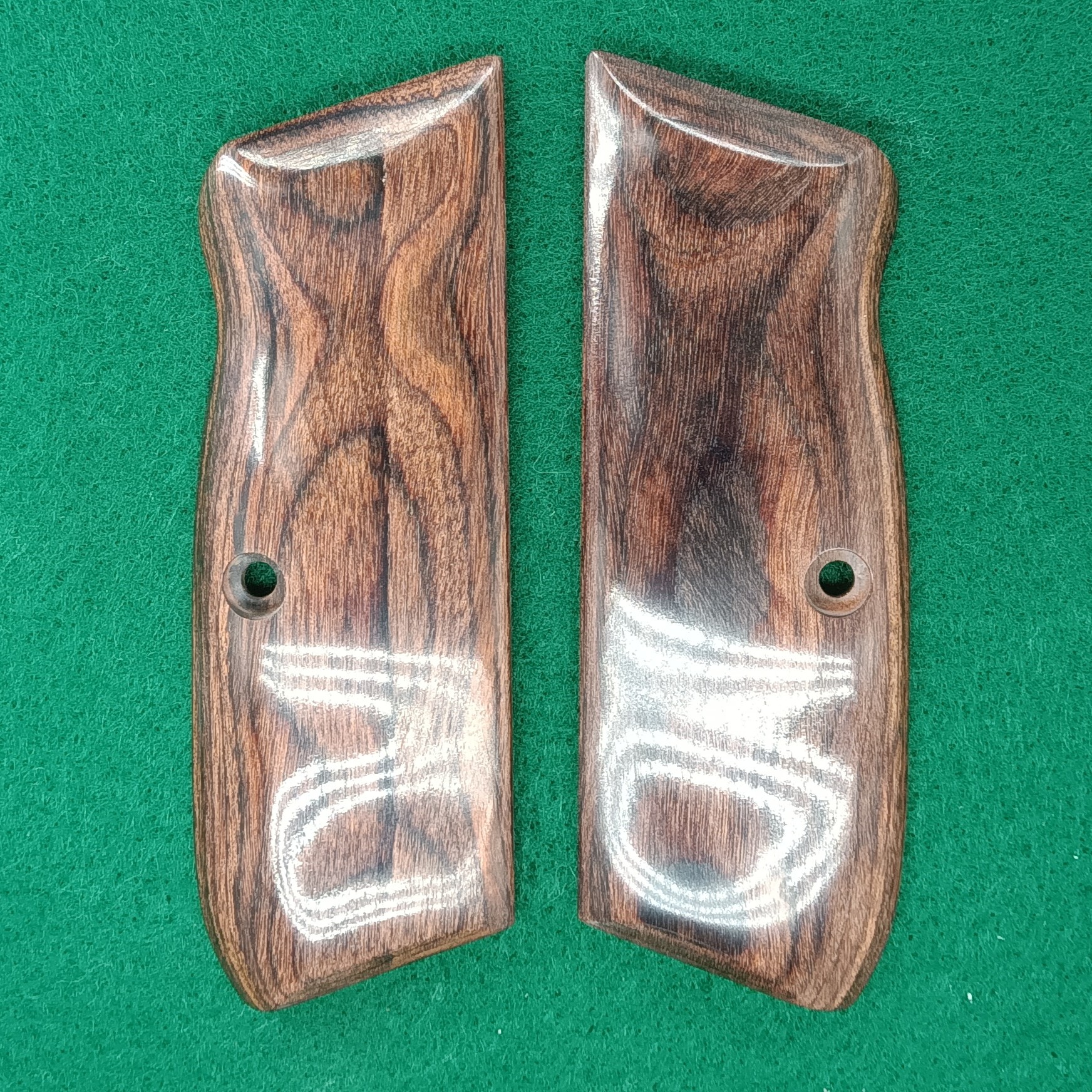 These beautiful CZ grips will fit all (non-ambi) full size 75, 85, and SP-01 models. Shown are our stock materials. These grips are available in a variety of natural and laminated woods and are finished with catalyzed lacquer . Checkering, custom engraving, inlays and other custom woods are available if you wish to contact us. Photo – Sample